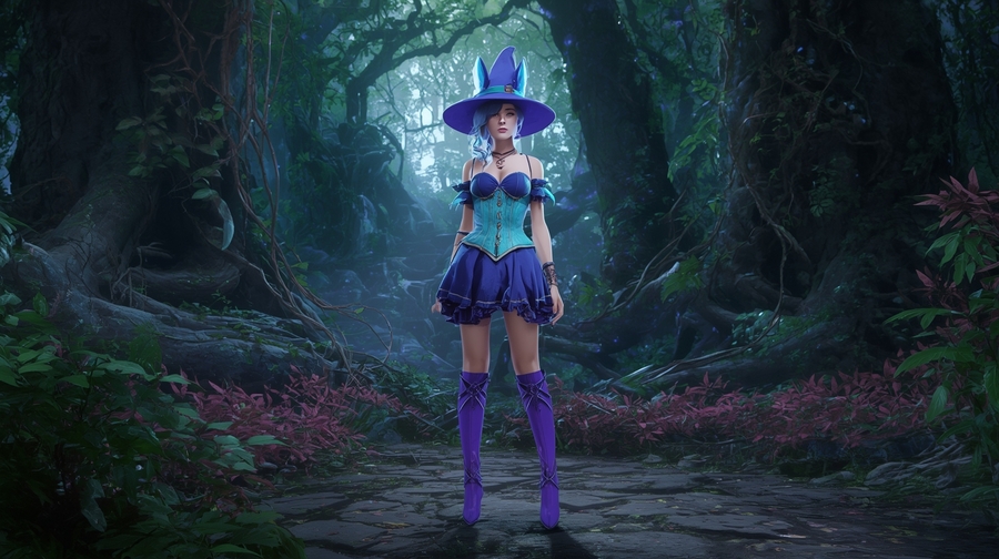 Fantasy world, the main character is a witch in a knee-length blue dress, the dress covers her shoulders and sleeves. In a blue-green corset, with blue hair, a blue hat with blue ears and purple knee-high boots with heels. The heroine stands in a full-length pose. Against the background is a cursed enchanted forest, with vines and thorns, not friendly plants. Unreal engine 5 render, realistic graphic AAA project