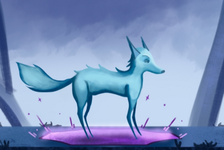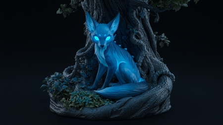 Merch for a fantasy game. A statuette of a blue ghostly fox, similar to a qiukne, with glowing blue eyes. A figure in a dynamic pose. A fox is sitting under a large tree, there are many vines and plants nearby. A dark palette