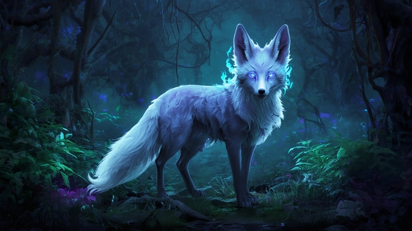 Fantasy world, a ghostly blue fox, an animal with a long tail, lots of fur, blue fire burning from its eyes. Her paws are dented, looks like a kitsune. Against the background of a cursed forest, with vines and thorns, unfriendly plants, a blue-green dark palette Unreal engine 5 render, realistic graphic AAA project