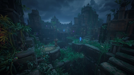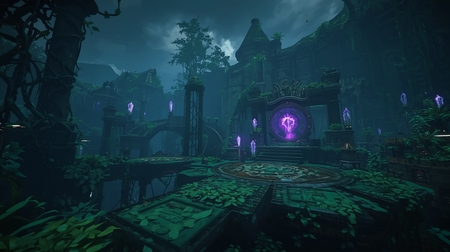 Fantasy locations for a 3d platformer, a cursed forest in a blue-green dark palliter, with vines, thorns, aggressive plants, the sky is cloudy and dark, the location has riddles, pressure plates, levers, purple portals. There are blue glowing crystals in some places. Forest with ruined catacombs of ancient architecture Unreal engine 5 render, realistic graphic AAA project