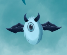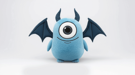 Merch for a fantasy game. A plush monster toy with one eye, a small oval blue body, no arms or legs, with wings like a demon’s and dark blue horns