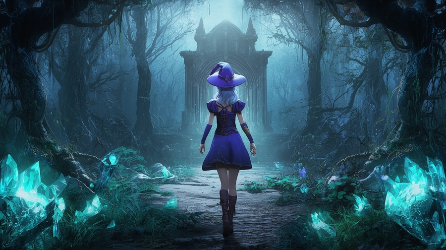 A poster for a fantasy game, against the background of a cursed forest with thorns and vines, a witch in a blue hat, blue ears and hair, in a knee-length blue dress covering her shoulders, a blue corset and purple boots, moves towards a dilapidated temple. There are a lot of blue glowing crystals around, but the atmosphere is dark.Unreal engine 5 render, realistic graphic AAA project