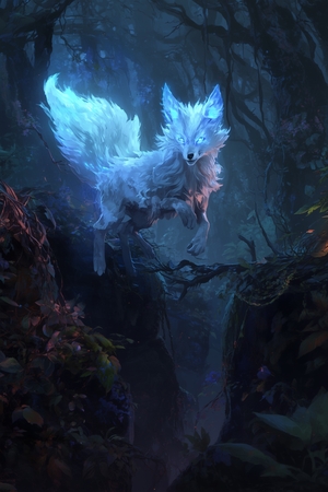 A poster for a fantasy game, a blue ghostly fox, similar to a kitsune, with burning blue eyes like fire, in a dynamic pose, jumps over a chasm in a cursed forest with vines and thorns. Unreal engine 5 render, realistic graphic AAA project
