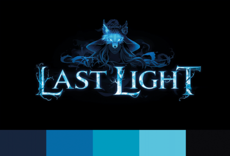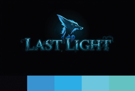 make a logo for a fantasy game called Last Light. She should be wearing a sorceress wearing a blue hat that turns into a blue glowing fox. The palette should be dark, but the logo itself should glow. The font of the game’s name should be fantasy and atmospheric, with patterns in the form of vines.
