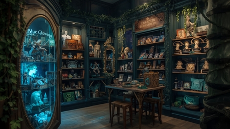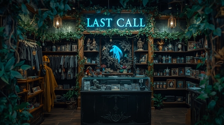 Branded souvenir shop for the fantasy game Last Call — the name is blue glowing. The store is decorated to match the atmosphere of a cursed forest with vines and thorns, unfriendly plants, and a dark blue-green palette. View of the store inside. On the shelves there are merch in the form of figures of chanterelles, sorceresses, and witches’ accessories, but attention is not focused on them. The emphasis on the interior is inside