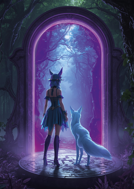 The poster for the fantasy game, the main character, a witch, in a knee-length blue dress, completely covers her body with shoulders, purple boots and a blue hat with blue ears, sits next to a blue ghostly fox, similar to a kitsune, whose eyes burn with blue fire. They are sitting together, the fox’s head on his knees Behind them against the background of a dark cursed forest, with vines and thornsUnreal engine 5 render, realistic graphic AAA project