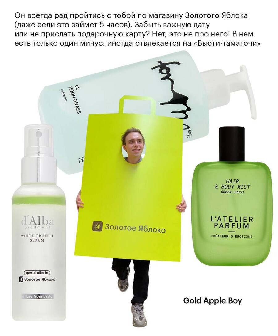 Один из самых популярных трендов — культ «парня, который оплатил корзину в Золотом Яблоке». В соцсетях формируется целая романтическая мифология, в которой мужчина, покупающий косметику своей девушке, автоматически становится идеалом партнера. В комментариях под видео восторг: «Это новый язык любви», «Парень, который пошёл с тобой в Золотое Яблоко золотой, храните его». Этот эффект работает потому, что покупка в ЗЯ — это не бытовой жест, а акт участия, поддержки, вовлечённости в мир эмоций девушки. Бренд не напрямую, но очень умело поддерживает этот нарратив: он романтизирует покупки, превращая простую транзакцию в ритуал привязанности. Так рождается новая социальная норма, где любовь можно выразить в лаймовой коробке, а проявить заботу в оплаченной корзине.