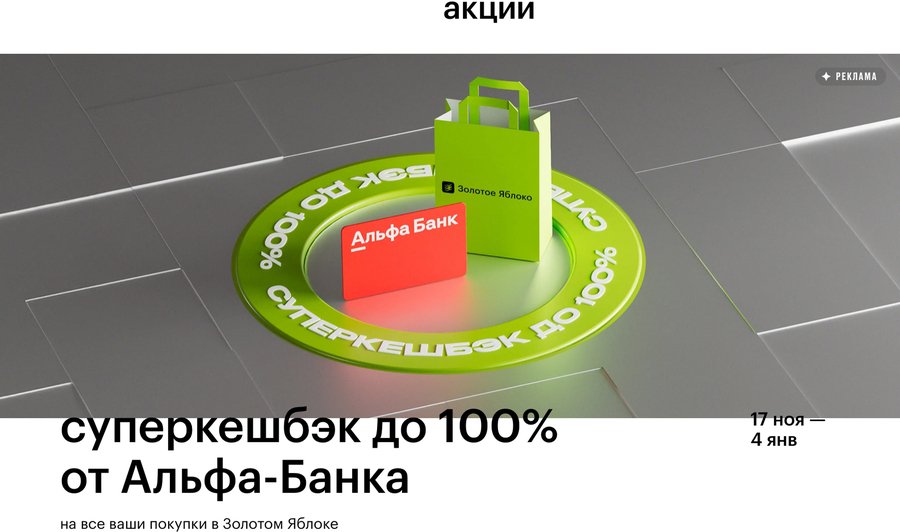 Например, коллаборация с Альфа-Банком стала одной из самых ярких: повышенный кэшбэк, оформленный в виде вирусной кампании, подкрепился музыкальным мотивом, короткой песней, которая моментально засела в голове пользователей. Этот мелодический хук выполняет функцию аудиобрендинга: стоит покупателю задуматься о том, как выгодно совершить покупку в «Золотом Яблоке», — мелодия всплывает в памяти, приводя к прямой ассоциации с Альфой.