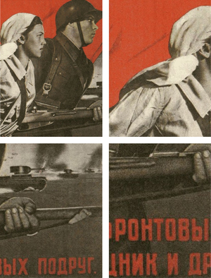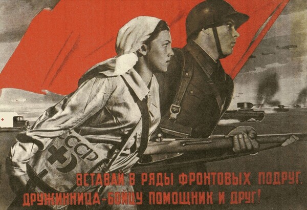 На советских плакатах, в отличие от британских и американских, женщины в военной форме почти не изображались. Однако реальная картина в СССР кардинально отличалась: именно здесь женщины массово и полноценно участвовали в боевых действиях в несопоставимых масштабах. Если в Великобритании на военной службе во время Второй мировой войны находилось 125 тысяч женщин, в США — 350 тысяч, в Германии — 500 тысяч, то в СССР число призванных на военную службу женщин превысило миллион человек [8, с. 66].