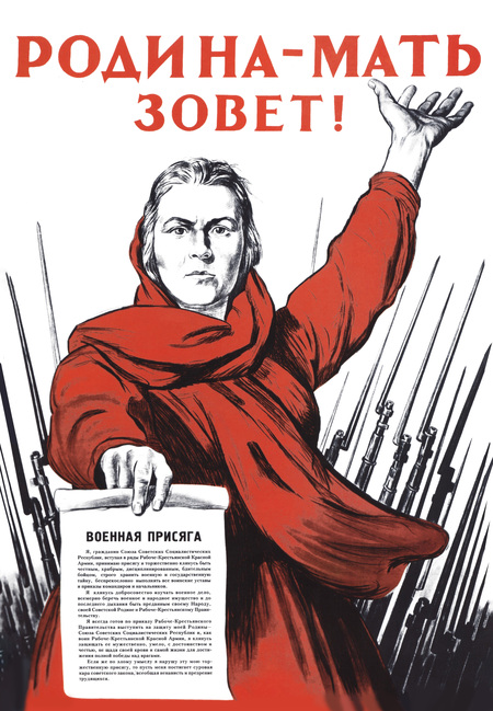 Заключительный образ, который я хотела бы рассмотреть, это «Родина-мать». На советских военных плакатах он стал символом патриотизма, единства и призыва к защите Родины. Этот образ олицетворяет мать, которая зовёт своих сыновей и дочерей на защиту Отечества. Одним из самых известных плакатов является работа Ираклия Тоидзе «Родина-мать зовёт!» (1941 г.). На нём изображена женщина в красной одежде, держащая в руках текст военной присяги, а за её спиной видны штыки. Этот плакат призывал к защите отечества и поднимал боевой дух [2, с. 2].