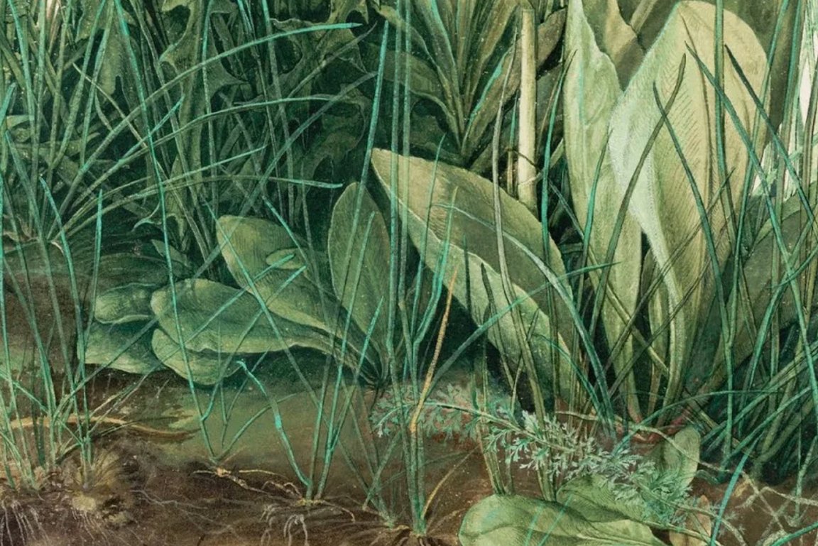 Если Босх является мистицизмом и аллегорией, то Дюрер представляет собой кульминацию научного наблюдения. В этой акварели живописец не ставит перед собой никакую духовную цели. Его задача — запечатлеть природу такой, какая она есть, в всем её несовершенном и насыщенном жизни разнообразии. Это независимый ботанический образ.