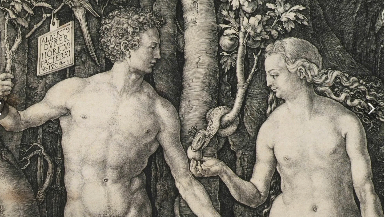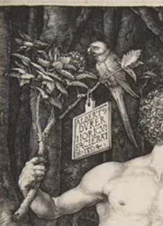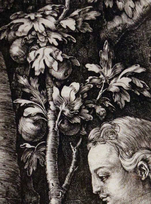 В данной известной гравюре на меди Дюрер, желая к совершенным пропорциям, также внимательно прорабатывает окружающий лес. Здесь растения выполняют не только фоном, но и значимыми сюжетными компонентами. Мы наблюдаем не одно Древо Познания, а целую серию растений, ссылающихся к рассказу грехопадения.