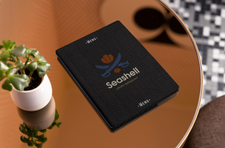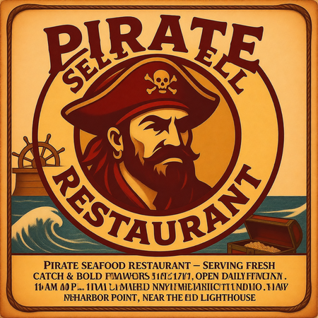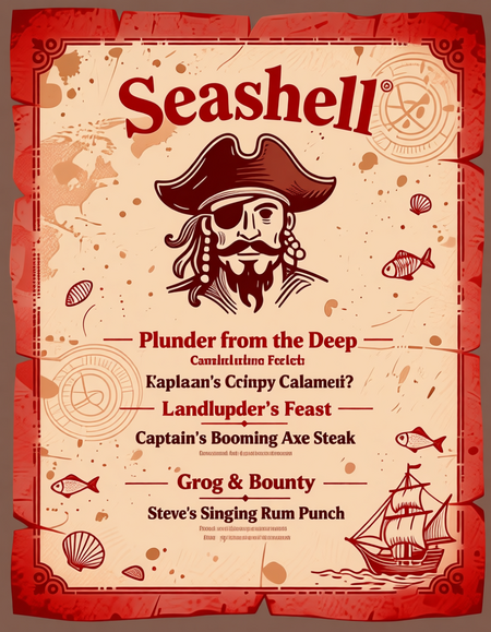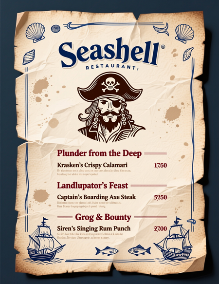Content & Typography: Restaurant Name: «Seashell» displayed largely at the very top, in a strong, bold, classic serif font in Navy Blue. Sections & Text: Use an elegant, readable serif font for dish descriptions in Deep Brown. Section headers (e.g., «Plunder from the Deep», «Landlubber’s Feast», «Grog & Bounty») should be in Dark Red. Menu Items: Include creative, pirate-themed dish names like «Kraken’s Crispy Calamari», «Captain’s Boarding Axe Steak», and «Siren’s Singing Rum Punch». Изображения были сгенерированы в нейросети Qwen, текст Промта писал Чат GPT.