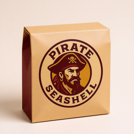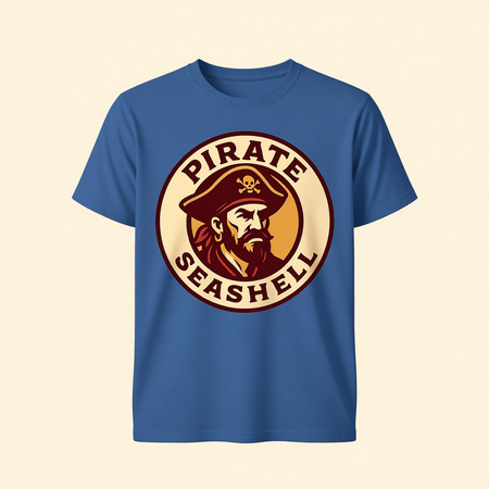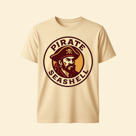 A professionally designed, single-page menu for a pirate-themed restaurant named «Seashell». Design & Layout: Style: Rustic, vintage tavern menu with a modern graphic twist. The design should look like aged, textured parchment (beige) with elegant, classic elements. Central Focal Point: At the top of the menu, prominently feature the restaurant’s main logo: a stylized, graphic line-art portrait of a pirate’s face. The logo should be monochromatic, using the deep brown or navy blue color. Color Palette: Strictly use the following color scheme: Beige: Primary background (parchment). Deep Brown: For most of the text and the logo outline (if not blue). Dark Red/Burgundy: For accenting major section headers (e.g., «Appetizers», «Main Course») and price highlights. Navy Blue: For the restaurant name «Seashell» and for decorative rules, borders, or small nautical icons (like tiny fish, shells, or ships).