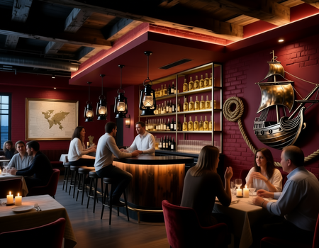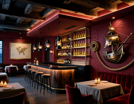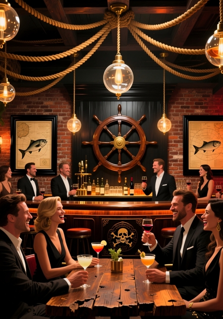 Подошедший Промт: Cover art illustration of the interior of a stylish, modern fish restaurant and bar with a distinct pirate theme. The scene is sophisticated yet rustic, featuring a large, polished dark wood bar, exposed brick walls, and modern nautical lighting. Pirate-themed elements are integrated tastefully: antique maps in sleek frames, ropes artfully draped, a large ship’s wheel as a central decor piece, and glass fishing floats used as modern pendent lights. A diverse group of well-dressed, modern patrons are sitting at a wood table, laughing and clinking glasses of craft cocktails and wine. The atmosphere is warm, vibrant, and upscale, with moody, dramatic lighting that highlights the textures of wood and glass. Style of a high-end digital painting, photorealistic details, cinematic composition, warm color palette with accents of deep red and gold.