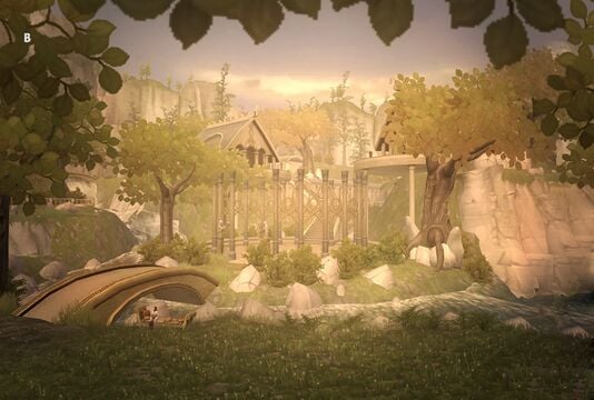 Ривенделл визуально коннотирует убежище, такое ощущение помогают создать высокие арки и вода как естественный барьер, память с помощью текущей резьбы, старых ступеней, и вневременность, смесь эпохальных стилей.