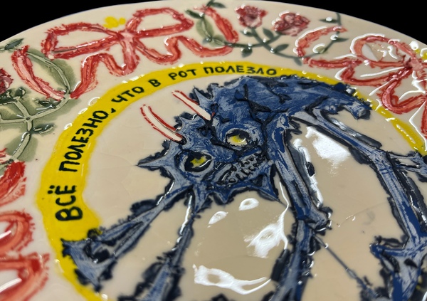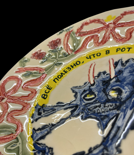 Вторая работа — тарелка из белой глины, расписанная цветными пигментами. Тематика изображения — «автопортрет», украшенный моей любимой поговоркой. В результате глазирования и повторного обжига тарелка несколько пострадала, что сказалось на видимости рисунка.