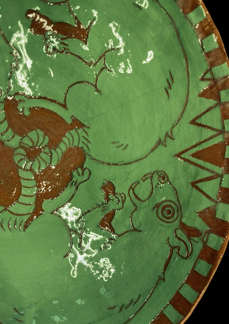 Первая тарелка из красной глины была покрыта зеленым ангобом, а затем расписана с помощью техники процарапывания. На тарелке изображен «крысиный король», стилизованный под индейскую роспись.