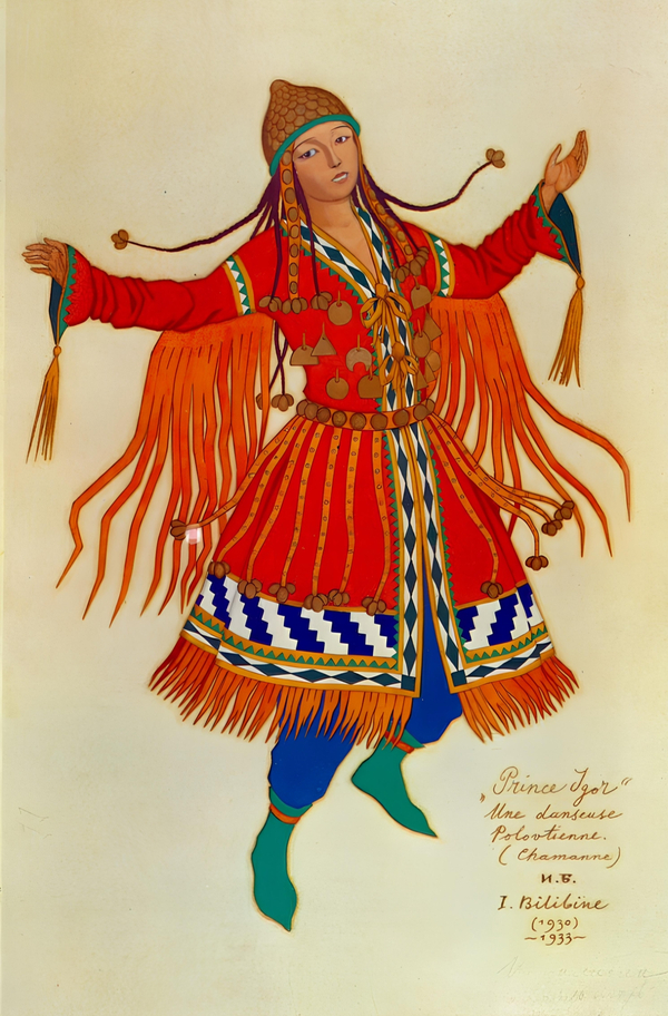 Костюмы Билибина едва ли можно назвать «этнографическими». В них собраны мотивы реальной крестьянской и городской одежды, элементы церковного облачения, богатые ткани, золочёные вышивки. Художник выстраивает цельный ансамбль: фактура ткани, крой, орнамент и цветовая гамма работают вместе, превращая фигуру артиста в живой символ.