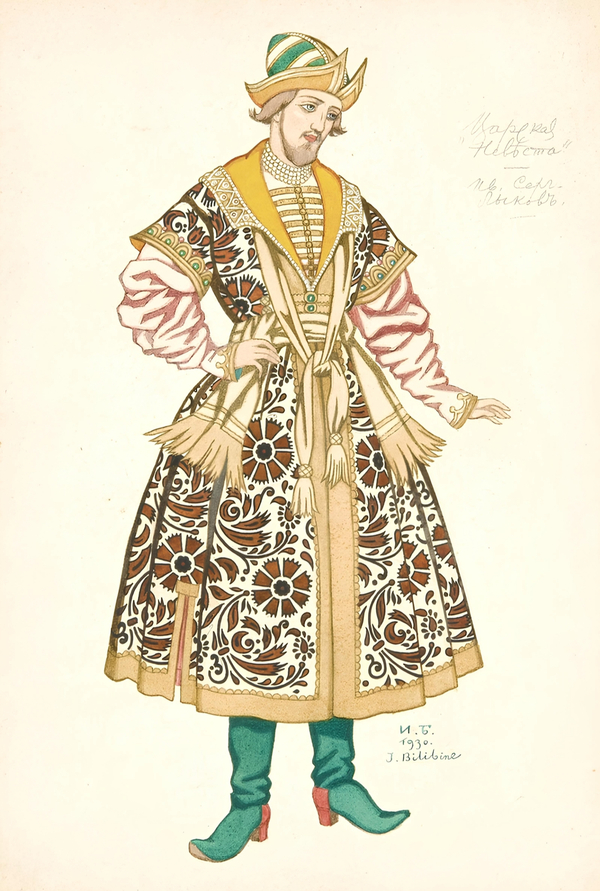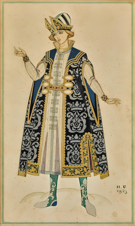 Эскиз костюма Царевича для балета Н. Н. Черепнина «Русская сказка». 1923// Эскиз костюма боярина Ивана Сергеевича Лыкова для оперы Н. А. Римского-Корсакова «Царская невеста». 1930