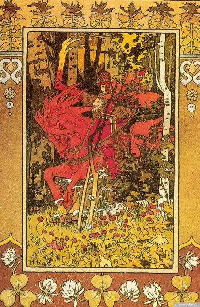 Иллюстрация из сказки «Сестрица Алёнушка и братец Иванушка» обрамлена характерным декоративным бордюром. В верхней части рамки — стилизованный узор в духе народной вышивки, по бокам — сказочные грибы и растительные узоры, обрамляющие сцену. Такой приём подчёркивает плоскостное решение композиции и погружает зрителя в атмосферу волшебной старины. Билибин довёл орнаментальное обрамление до совершенства, объединив изображение и украшение страницы в единый стиль. Это новаторское для своего времени решение стало одной из визитных карточек его творчества.