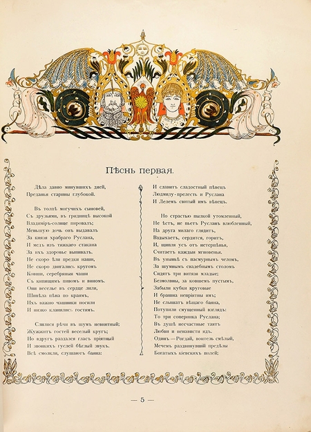 Обращение к наследию древней Руси стало отправной точкой формирования национального стиля. Художники тщательно изучали орнаментику древнерусских рукописей, икон и храмового убранства. Так, Иван Билибин, будущий ведущий мастер «русского стиля» в графике, увлекался старопечатными книгами и миниатюрами, глубоко исследовал старинные шрифты, заставки и инициалы. Билибин, оформляя книги, выписывал названия сказок вязью и разрабатывал декоративный шрифт на основе устава и полустава. Древнерусское искусство снабдило мастеров богатым репертуаром мотивов — от геральдических двуглавых орлов и византийских плетенок до узоров деревянной резьбы в старых теремах. Именно синтез традиций средневекового искусства с новыми формами лежит в основе русского стиля.