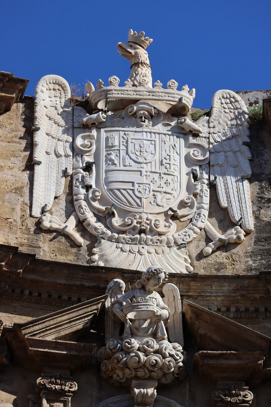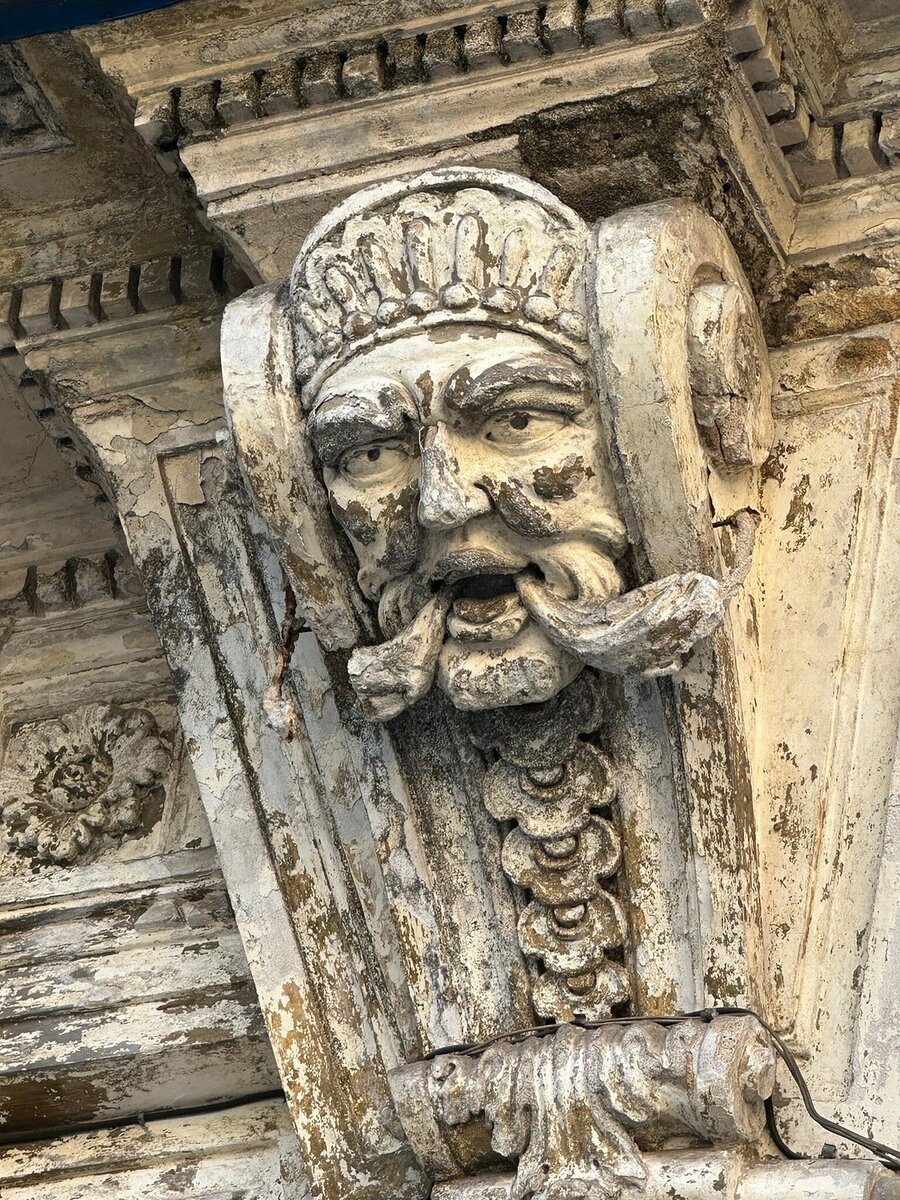 Ворота, которые ведут во двор этого здания, тоже переносят нас в сицилийское барокко. Здесь присутствую театральные маски (маскароны) по обеим сторонам — тоже довольно распространенный приём в сицилийском барокко
