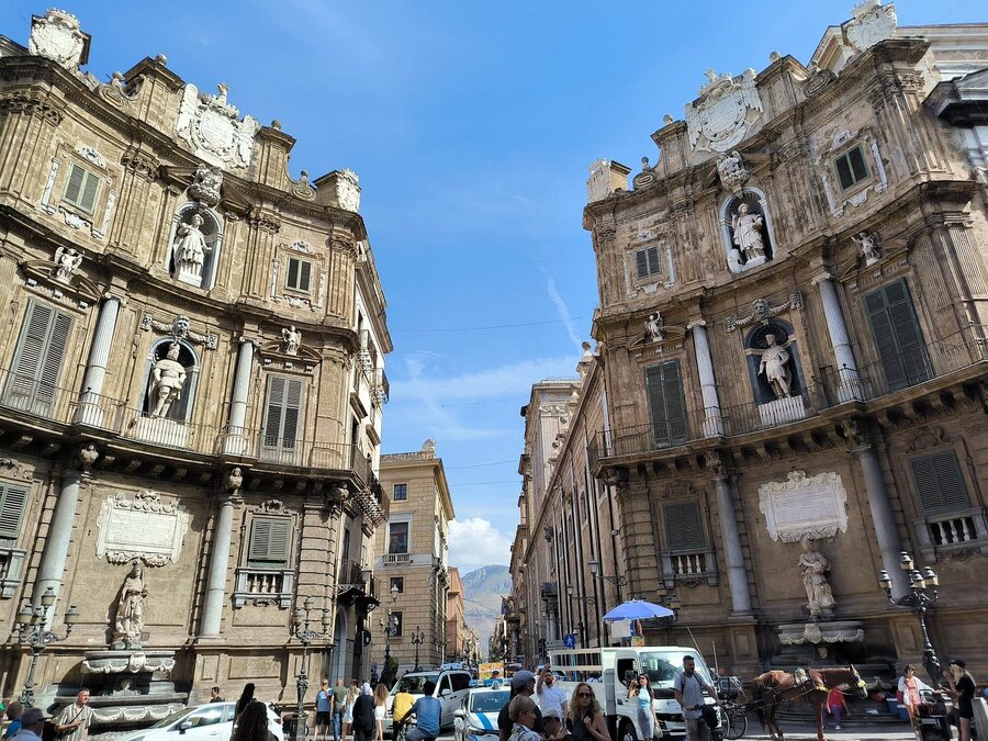 Quattro Canti — это архитектурный ансамбль в стиле сицилийского барокко, построенный в начале XVII века как оригинальное художественное решение градостроительного пересечения двух главных улиц города. Площадь представляет собой восьмиугольник с четырьмя одинаковыми, симметричными фасадами с закругленными срезанными углами зданий, украшенных скульптурами и барочными элементами.