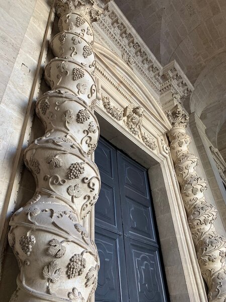 Колонны этого здания обвивают гроздья винограда на ветках — такой прием также характерен для сицилийского барокко