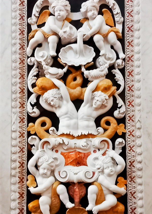 Здесь можно увидеть, как на темном фоне прекрасно выделяются рельефные скульптуры, колонны из мрамора libeccio и полихромные инкрустации. Не зря мастера любили этот материал — он создает отличный контраст и выглядит очень изысканно в интерьере храмов
