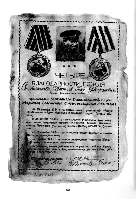 Слева представлен документ периода блокады Ленинграда: четыре благодарности вождя. Они принадлежат дедушке Ольги Лаврентьевы. Благодарность за военную операцию в заполярье, освобождение городов в Мурманской области, за освобождение норвежского города Киркенес, за освобождение Печенгской области от немецкого захвата.