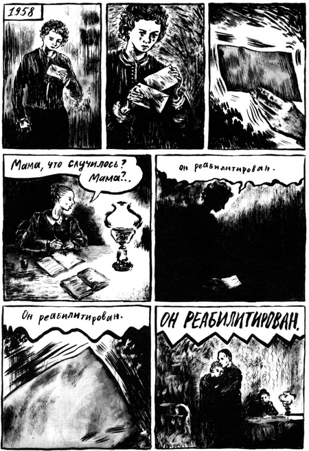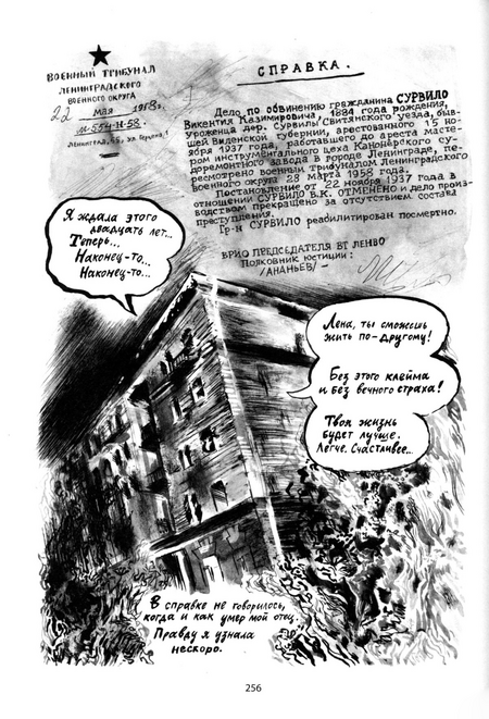 На 8-й странице 280-й главы графического романа можно увидеть также документ, где перечеркнуто то, о чем долгое время замалчивали. Ведь дочь «врага народа» не могла бы получить медаль даже за героический поступок и службу отечеству.