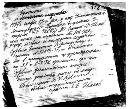 Ольге Лаврентьевой пришлось запоминать визуальное содержание документов так, чтобы потом смочь перерисовать недостающие строки по памяти и поместить их в комикс. Также она старалась по возможности делать письменные заметки, фрагмент которых можно увидеть справа. На зарисовке папки можно заметить скрепки, которыми подпирались бумажки поверх дел уголовников в архивах, чтобы люди, запросившие документы не смогли увидеть «лишнее».