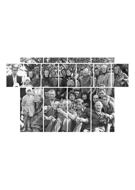 Автор переосмысливает фотографию через призму архитектурной памяти, в данной многофигурной композиции выражен яркий религиозный и символический контекст. Посмертная фотография пересекается с композицией иконостаса. Она состоит из блоков разного типа, общая картина создает особый ритм. Общий силуэт полиптиха создает монументальный эффект. Смысловое значение коллажа связано с памятью прошлого и утратой, рамки, в которые заключены герои сравнимы с образом надгробных портретов.