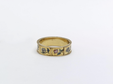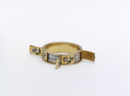 Кольцо из эмали и золота, украшенное розами и маргаритками, представляет собой один из наиболее изобретательных примеров Викторианского романтического кодирования. Маленькие шарнирные панели, расположенные по всей окружности кольца, открываются, обнажая французские надписи: «Je t’aime un peu» (я люблю тебя немного), «Je t’aime beaucoup» (я люблю тебя сильно), «Je t’aime passionnément» (я люблю тебя страстно), «Je t’aime pas du tout» (я не люблю тебя совсем). Эти фразы восходят к детской игре с отрыванием лепестков маргаритки, где каждый лепесток предсказывал степень чувств. Сама маргаритка в языке цветов символизировала невинность и чистоту, а роза — страстную любовь.