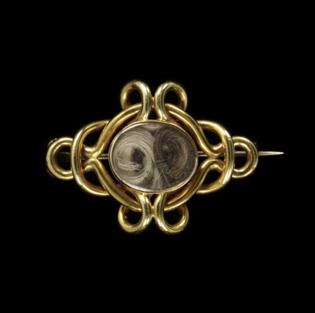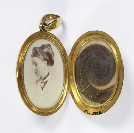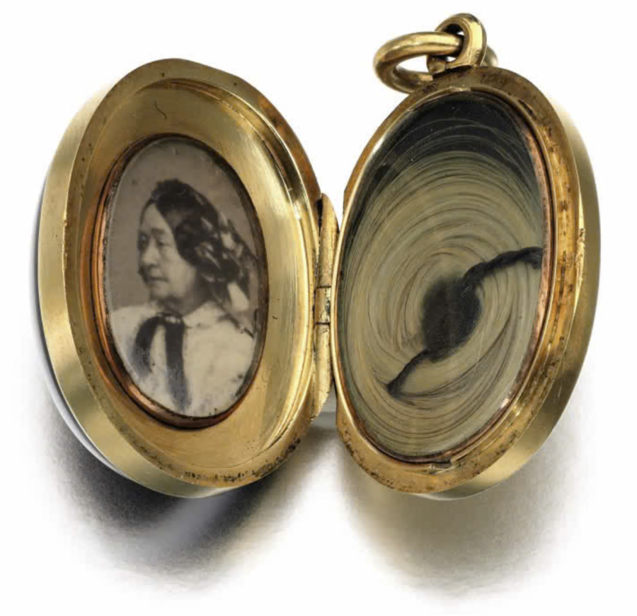 Один из характерных примеров — медальон, в котором на одной створке размещён фотопортрет молодой женщины, а на другой — аккуратно вплетённый локон её волос. Такой личный медальон превращался в реликвию, его дарили ближайшим родственникам или друзьям покойной. Локоны, часто завивавшиеся в сложные мотивы — веночки, инициалы, цветочные узоры — помещались под стекло или в скромной золотой оправе. Пример тому — французская золотая брошь из собрания Метрополитен-музея. Такие предметы не бросались в глаза своей роскошью, но хранили «меланхолию как нравственный долг» — память о прошлом, уважение и сдержанное выражение скорби.
