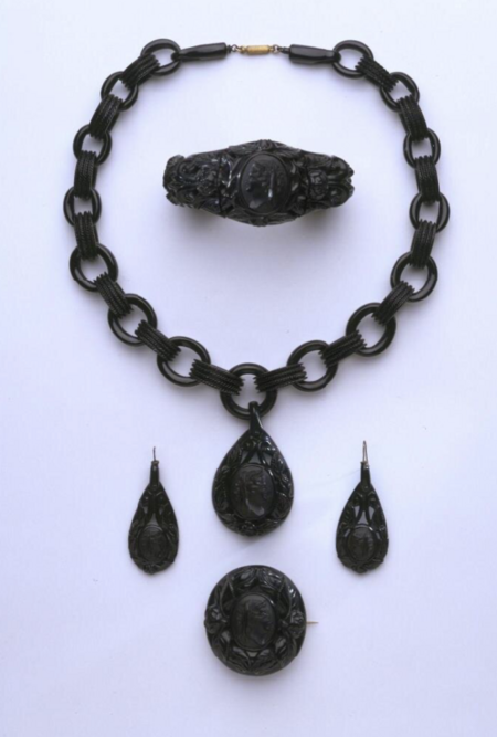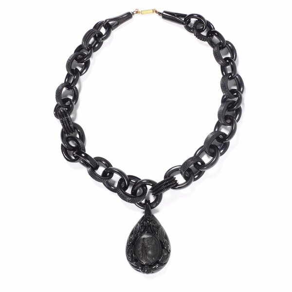 Это ожерелье, выполненное полностью из натурального уитбийского гагата, представляет собой вершину викторианского переосмысления красоты в контексте траура. Медальоны, выгравированные в центре украшения, изображают женские головы, символизирующие «Ночь», окруженные розами и листьями. Гагат, материал, из которого создано ожерелье, был добыт в угольных образованиях у побережья Йоркшира, где он существовал в течение 180 миллионов лет. К 1872 году в Уитби работало около 1500 человек, обрабатывающих гагат для ювелирного производства, превращая это образование в экономический феномен, соизмеримый с золотой лихорадкой. Характерная деталь: ожерелье часто шло в составе целого гарнитура, включающего браслет, брошь и серьги. Эта координированность была важна не только с эстетической точки зрения — она демонстрировала, что скорбящая женщина была достаточно состоятельна, чтобы заказать полный комплект траурных украшений, что само по себе было символом социального статуса. Траур был делом дорогостоящим: после завершения первого, самого глубокого периода траура женщина должна была приобрести новый гардероб и новые украшения для «полутраура», что благодатно сказывалось на английской текстильной и ювелирной промышленности.