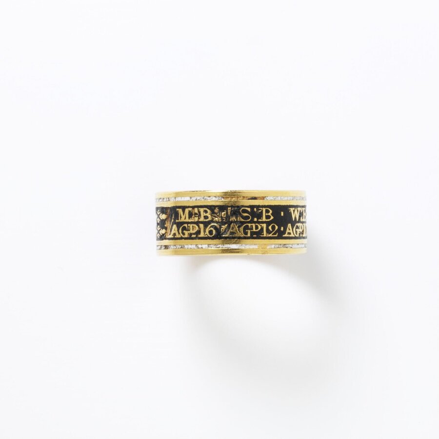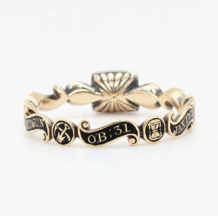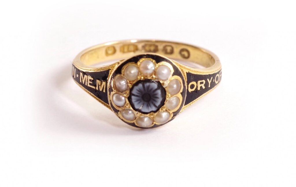 Траурные кольца были особой категорией объектов, отличаясь от других траурных украшений своей интимностью и юридической значимостью. Часто они заказывались самим умирающим человеком как часть завещания, с подробными указаниями относительно того, кто должен получить кольцо и в каком количестве экземпляров. На кольцах гравировались имена умерших, даты смерти, иногда девизы или религиозные изречения. Материалы для траурных колец выбирались в соответствии с социальным статусом и отношением к умершему. Белая эмаль указывала на то, что умерший был ребенком или незамужней девушкой. Черная эмаль или черный камень использовались для взрослых.