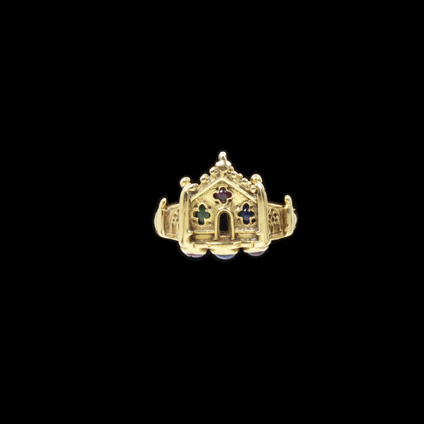 Кольцо, спроектированное художником Чарльзом Рикеттсом и выполненное ювелиром Карло Джулиано, представляет собой более метафорический подход к изображению привязанности. На вершине кольца возвышается дома башня, увенчанная кабошоном граната. Хотя на первый взгляд украшение может показаться архитектурным капризом, его смысл уходит корнями в еврейскую традицию брачных колец, где башня символизирует либо Храм, либо будущий дом новой семейной пары. Башня как символ здесь приобретает значение защиты и постоянства.