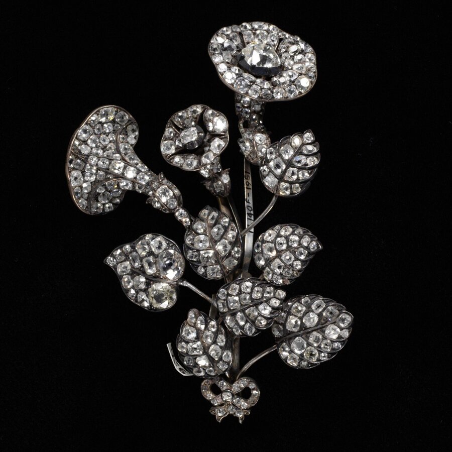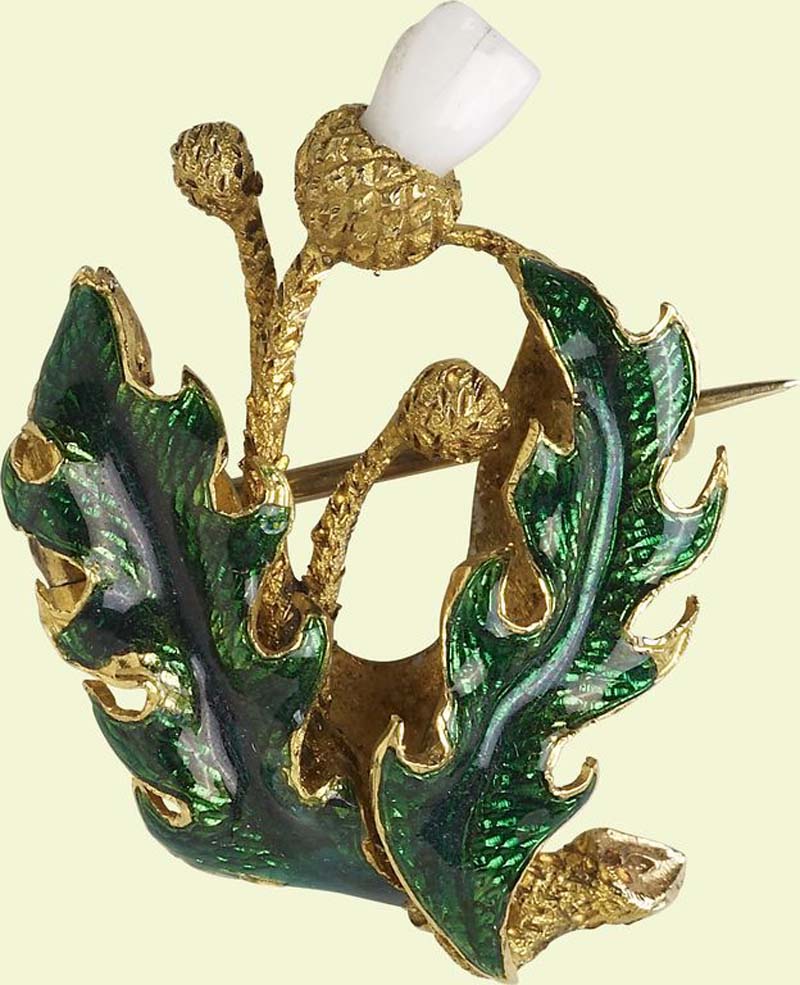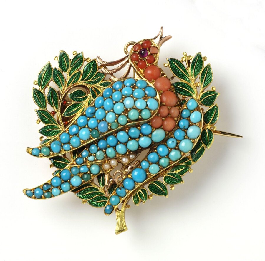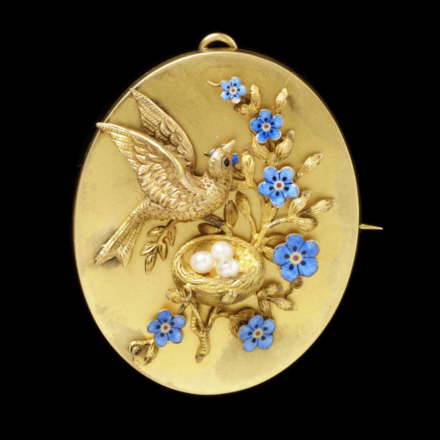 Брошь из золота, серебра, бриллианта и эмали изображает руку в розовой манжете, держащую виноградную лозу и синий цветок с бриллиантом в центре. Синий цветок в викторианском языке цветов говорил о любви, а бриллиант заявлял о вечности. Рука с манжетой была популярным мотивом в Викторианском ювелирном искусстве, восходящим к римским временам, когда сжатые руки использовались в кольцах как символ верности и согласия. Натуралистические мотивы Викторианских украшений остаются свидетельством эпохи, когда природа была одновременно объектом научного интереса, эстетического восхищения и глубокого символического кодирования — эпохи, когда каждый цветок мог рассказать историю любви, каждая птица могла нести послание надежды, а каждое украшение было живым текстом на языке, понятном лишь тем, кто знал его грамматику.