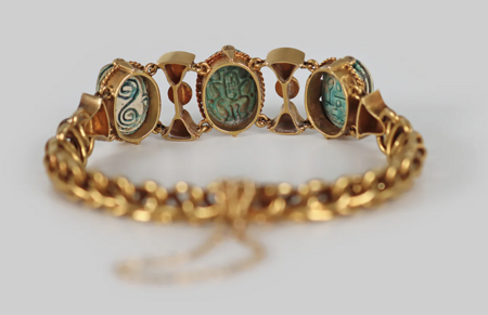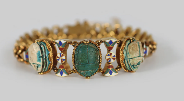 Интерес древним Египтом охватил Европу после наполеоновских экспедиций и открытия Розеттского камня. Викторианское «египетское возрождение» стало самостоятельным феноменом: украшения стилизовались под лотосы, скарабеев, священных кошек, солнечные диски, папирус и иероглифы. Мастера Castellani, Tiffany, Cartier и другие создавали эффектные изделия с эмалью и цветными камнями, часто используя золочёный металл и цветное стекло для имитации археологических находок. Египетский стиль нёс не только моду на экзотику, но и ассоциации с загадочностью, вечной жизнью и царской властью, а также ощущением сопричастности к великой цивилизации прошлого.