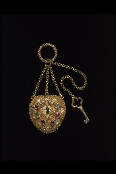 Как идеальный пример кодирования любви, рассмотрим этот медальон из коллекции Виктории и Альберта. Изделие функционирует как замок с ключом. Этот медальон воплощает самую классическую викторианскую фразу — «ты держишь ключ от моего сердца», метафору всеобъемлющей любви. Символизм этого украшения не ограничивается лишь этим. На медальоне драгоценные камни расположены так, что их первые буквы образуют слово REGARD (забота, внимание). Рубин, изумруд, гранат, аметист, рубин и алмаз. Эта техника была чрезвычайно популярна и одновременно передавала тайное послание — только тот, кто использовал код, мог расшифровать камни.