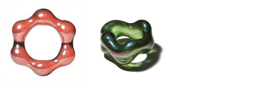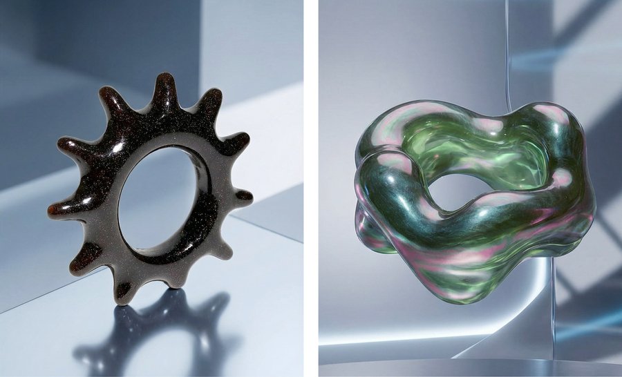 Сформулировав и определив идею и дизайн серии предметов, я сгенерировала кольца в Midjourney, используя мудборд подходящих текстур и дизайнерских решений и промпт «simple ring made of plastic on a clean white background»