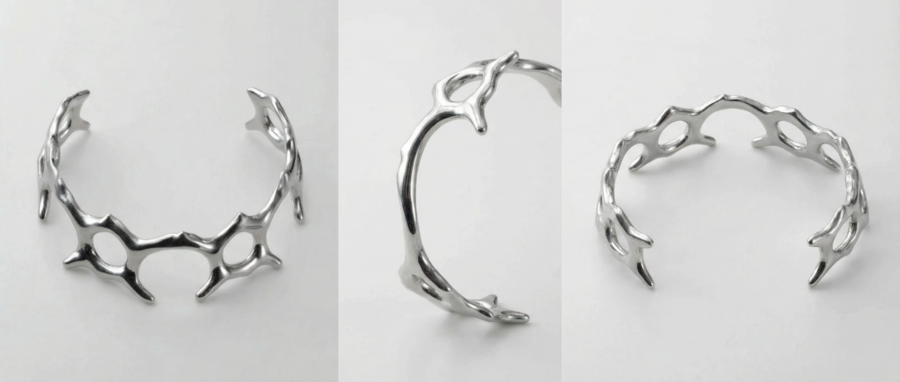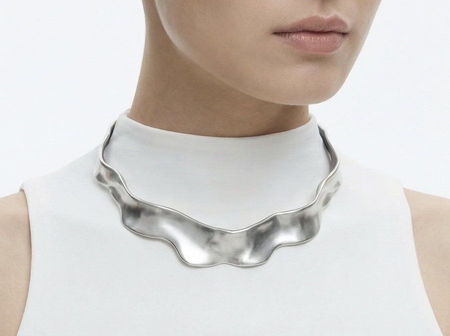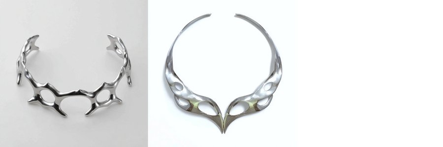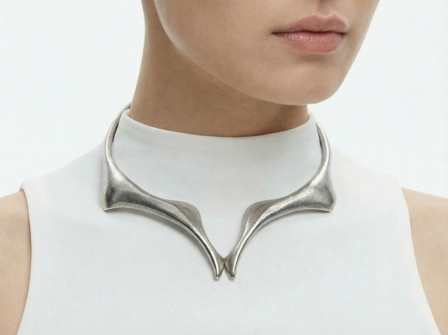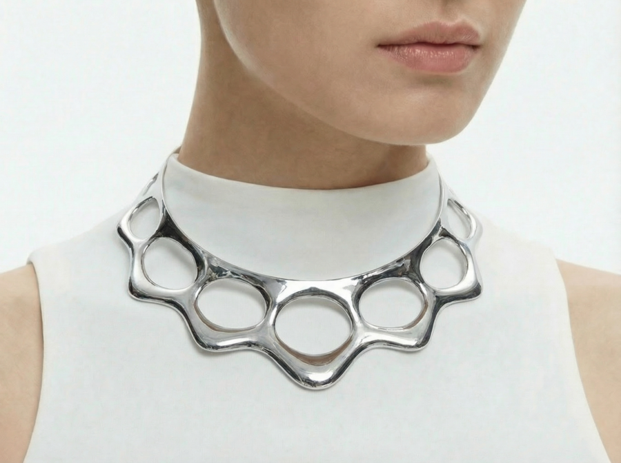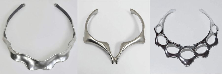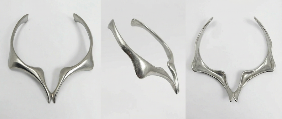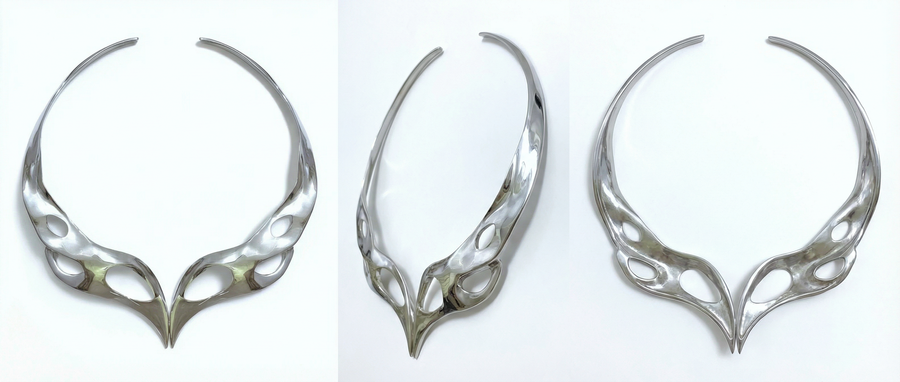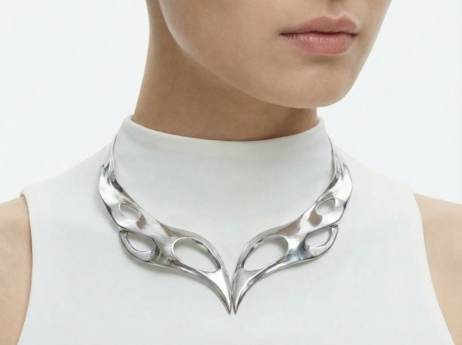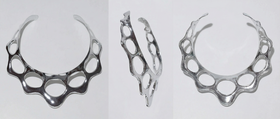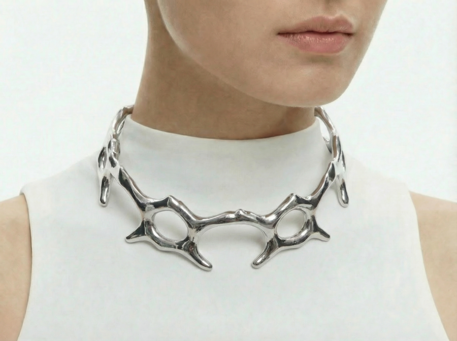 Ожерелья из коллекции «BIOFRACTAL» исследуют фрактальность живой природы — повторяющиеся узоры, которые встречаются в костных структурах, сотах, корнях растений и микроскопических организмах. Металл ведёт себя как органическая ткань: он не геометричен, а растёт, ветвится и перетекает.
