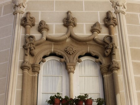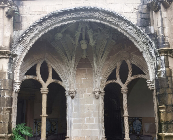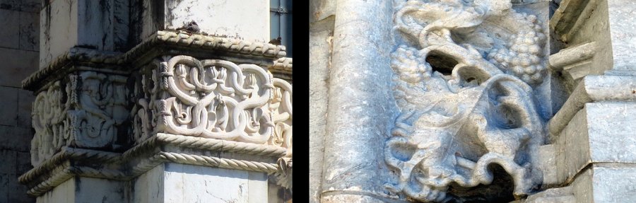 Ниже — пример слияния готического и мавританского стилей, окно (бифора) здания Garcia de Resende. Центральная колонна заканчивается мавританской капителью, две боковые узором, напоминающим веревки. Окно имеет готическую форму, но только с более объемными деталями вокруг. Сами арки полукруглые, над ними видна круглая лепнина, привязанная канатами (корабельная тематика) к боковым столбам, заканчивающихся острыми наконечниками в виде растений.