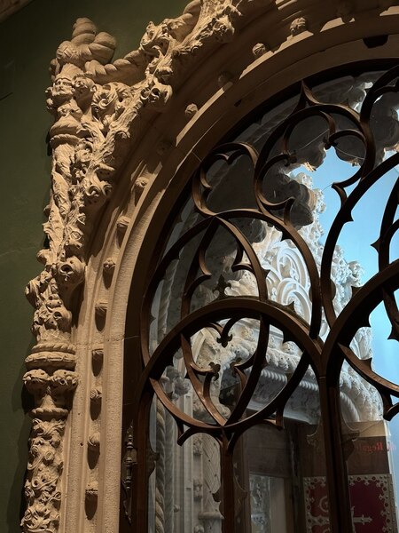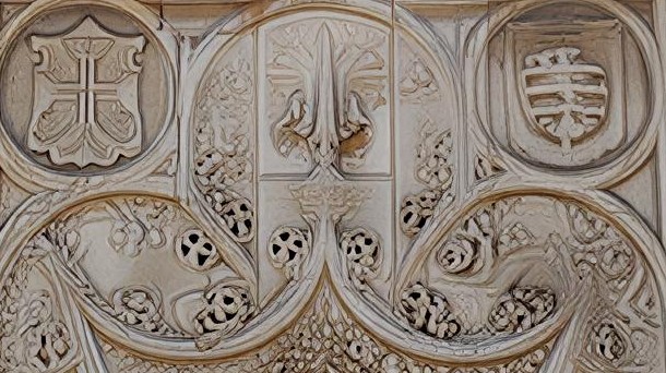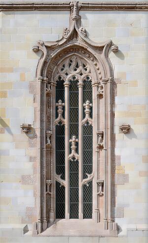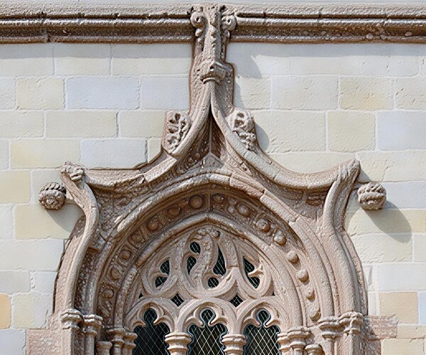 Ниже представлено окно сложной формы с плавными изгибами наверху. По краю арок струится растительный орнамент. Лоза точно обвивает арку, повторяя ее форму. Над окнами тоже видны природные мотивы, можно даже разглядеть птичье гнездо. Завершается композиция большими переплетающимися стеблями, которые обрамляют окна и закругляются кверху. В центре, как водится, королевский герб.