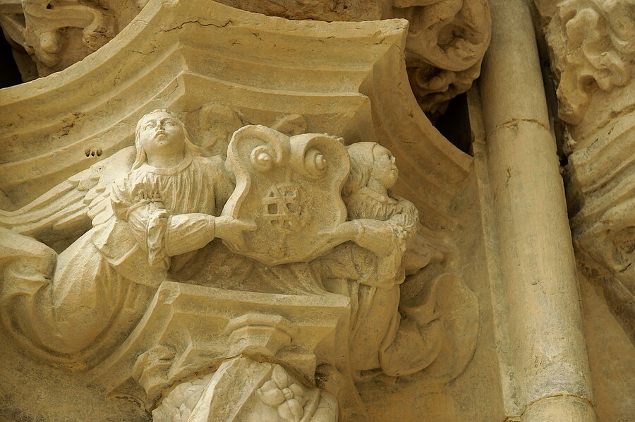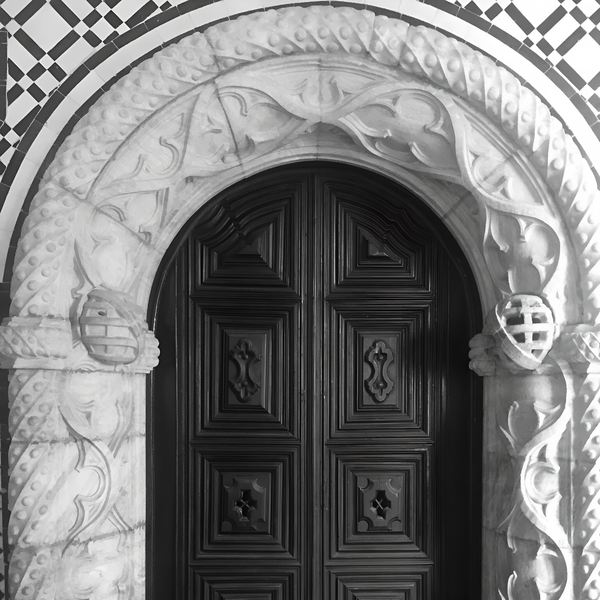 Перед нами двойная дверь часовни Сан-Мигель с тройной колонной посередине. Форма арок похожа на «плоские» трилистники. С каждой стороны есть несколько тонких полуколонн, чередующихся с полосами изящно вырезанной листвы. Из центрального трилистника протягиваются стебли, образующие форму креста. Перекладины креста заканчиваются декоративными навершиями (флеронами). С каждой стороны креста находятся щиты. Под крестом изображен щит с королевским гербом, слева от него — орден Христа, справа — армиллярная сфера. По бокам всей конструкции — два спиралевидных стержня, как будто два стража, охраняющих вход.