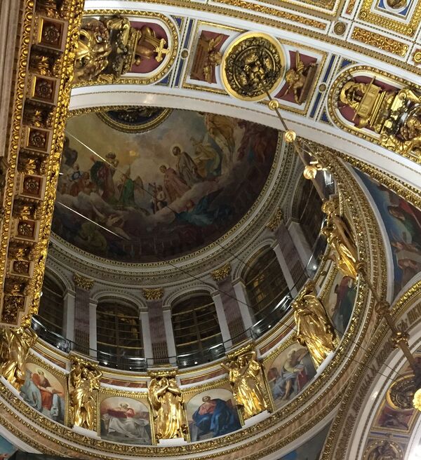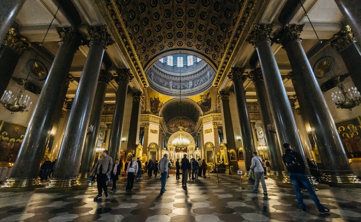 Символика цвета и материала усиливала смысловое восприятие. Позолочёные карнизы, мраморные панели и полихромные элементы отражали свет и подчёркивали центр помещения, как в Исаакиевском соборе или Большом Кремлёвском дворце.