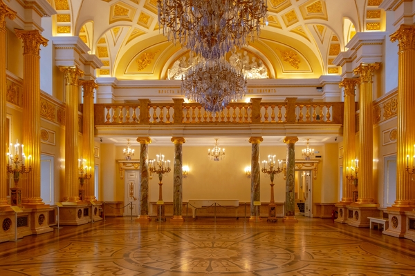 В Большом Кремлёвском дворце мраморные пилястры поддерживают карниз, а их полированная поверхность отражает свет, акцентируя центральные зоны зала.