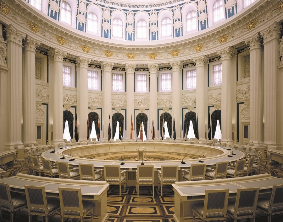 А в Зале Сената использованы контрастные фризы и бордюры, что создаёт глубину и акцентирует главные оси.